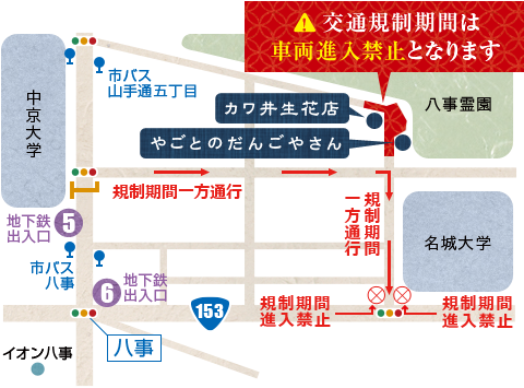 - 地下鉄名城線・鶴舞線「八事駅」6番出入り口より徒歩約6分です。お気をつけてお越しください。